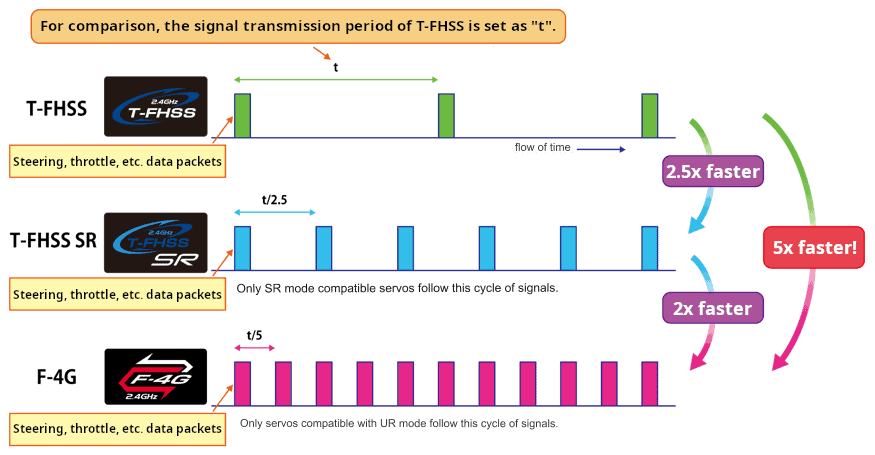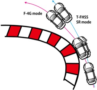 By shortening the transmission cycle and using the diversity system, a faster and more stable response is ensured. In addition, the telemetry function could not be available in the previous fastest mode, T‑FHSS SR mode, but the F-4G can use it.